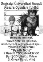 7 Kasım Cuma günü saat 17:00'da, BÜOK Gerçek Macera Oyunları Kulübü ilk anime gösterimlerini Death Note ile gerçekleştirecek. 1. erkek yurdunun alt katındaki kulüp odasında düzenlenen, anime severleri bir araya getirmeyi ve animeyle ilgilenmek isteyenleri bilgilendirmeyi amaçlayan etkinlikle ilgili her türlü sorularınızı buok@boun.edu.tr adresine iletebilirsiniz. Dışarıdan gelecek olan seyircilerin, sorun çıkmadan girebilmeleri için bu adrese isim bildirmeleri gerekebilir.